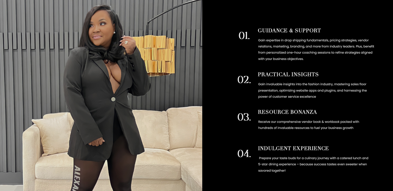 "The Bink & Bougie Masterclass is a game-changer for entrepreneurs ready to elevate their business to new heights! From the moment I joined, I knew I was in for an incredible journey. The practical insights into the fashion industry and the personalized support during the coaching session were invaluable. The class not only equipped me with the knowledge but also provided an indulgent experience with a catered lunch and 5-star dining. Don't miss out on this opportunity to revolutionize your business!"