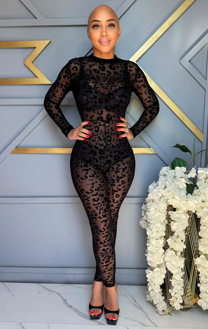 Unleash your wild side in the Leopard Tease Mesh Bodysuit. This fitted sheer jumpsuit with a flocked velvet leopard pattern brings fire and finesse. Wear it with heels, boots, or under a statement jacket — she’s a whole vibe.