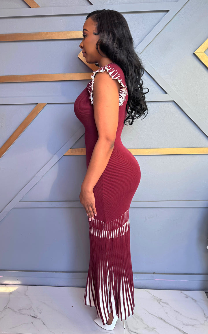 Serve rich, refined, and ready-to-stun in the Merlot Ruffle Elegance Knit Maxi Dress. This curve-hugging knit features a gorgeous merlot hue, soft stretch, and flirty contrast ruffle sleeves. The pleated hem adds movement and sophistication, making this dress perfect for holiday parties, date nights, and luxe everyday glam.