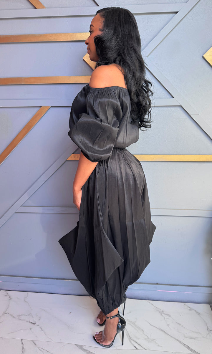 The Midnight Breeze Off-Shoulder Bubble Set is drama, movement, and elegance all wrapped in one. This lightweight set features an off-shoulder bubble-sleeve crop top paired with flowy, cinched-ankle pants that float with every step. A chic, effortless statement — perfect for brunch, rooftop nights, or vacation dinners.